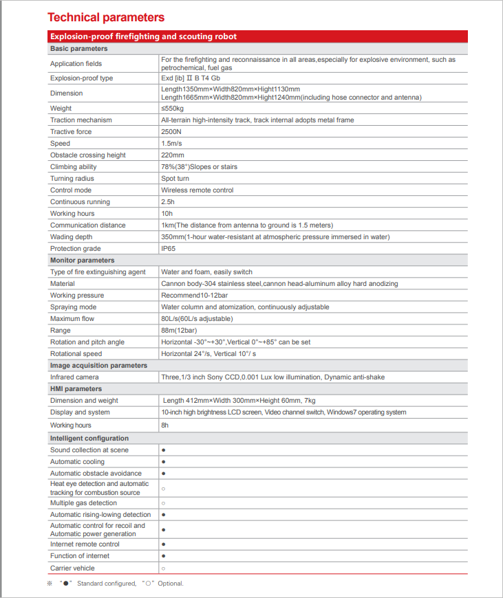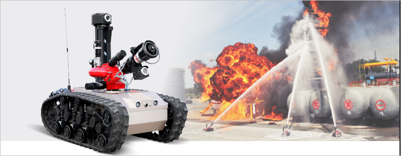 Explosion-Proof firefighting and scouting robot is designed and certified for fire-extinguishing and reconnaissance in explosive environment, such as petrochemical refining, oil and fuel gas storage, and other chemical manufacturing, storage, transportation site, etc. The product consists of robot platform with monitor, remote control panel. It will help the fireman crew improve the rescue safety and reducing casualties in the mission.